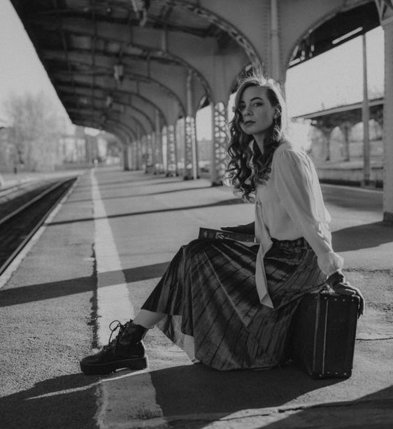 She raises her brown eyes across the tracks